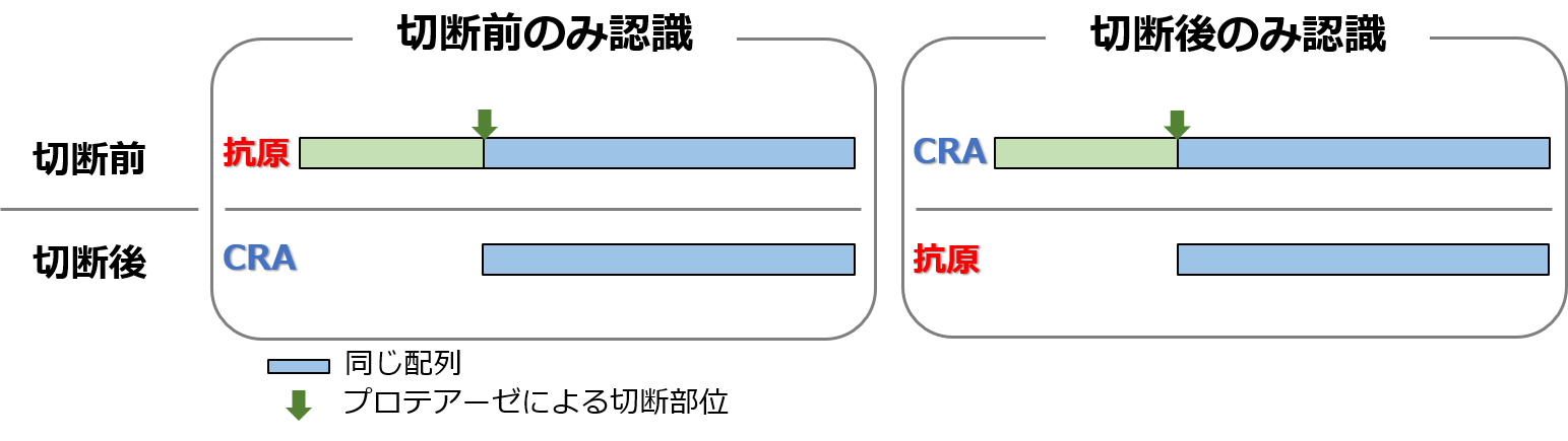プロテアーゼにより切断される前のタンパク質、あるいは、切断後のタンパク質を見分ける抗体を作製する場合、見分けたい場所により、設定する抗原が異なります。