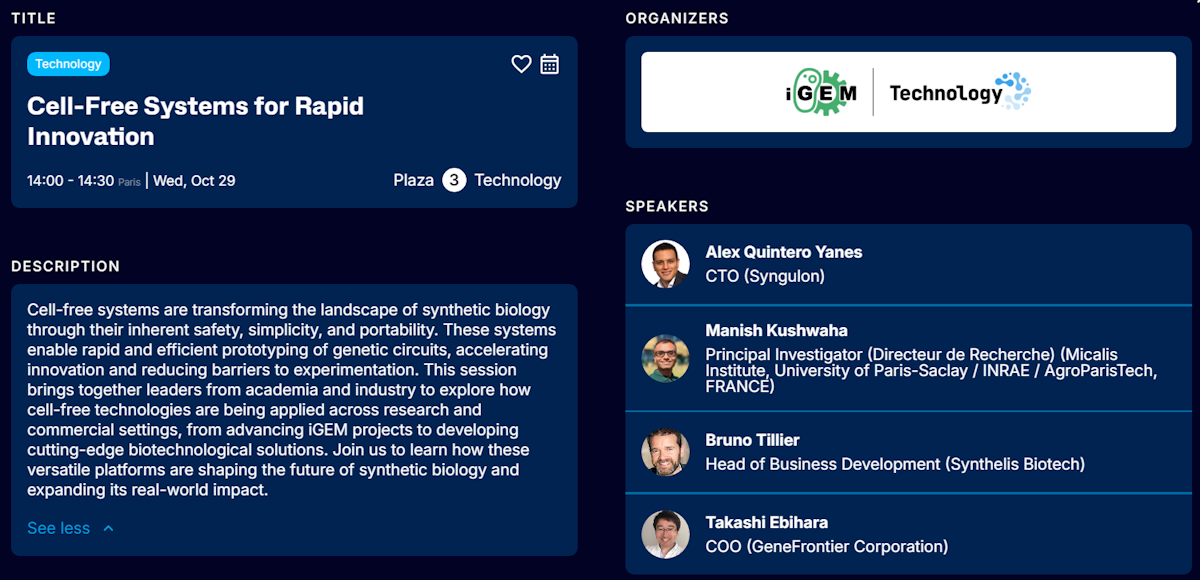 10月29日 14:00 – 14:30, Plaza 3 (Technology) “Cell-Free Systems for Rapid Innovation”