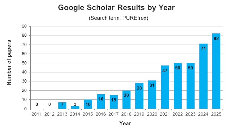 2011年の発売開始以来、PUREfrex®は多くの論文で引用されており、その数は年々増加しています。